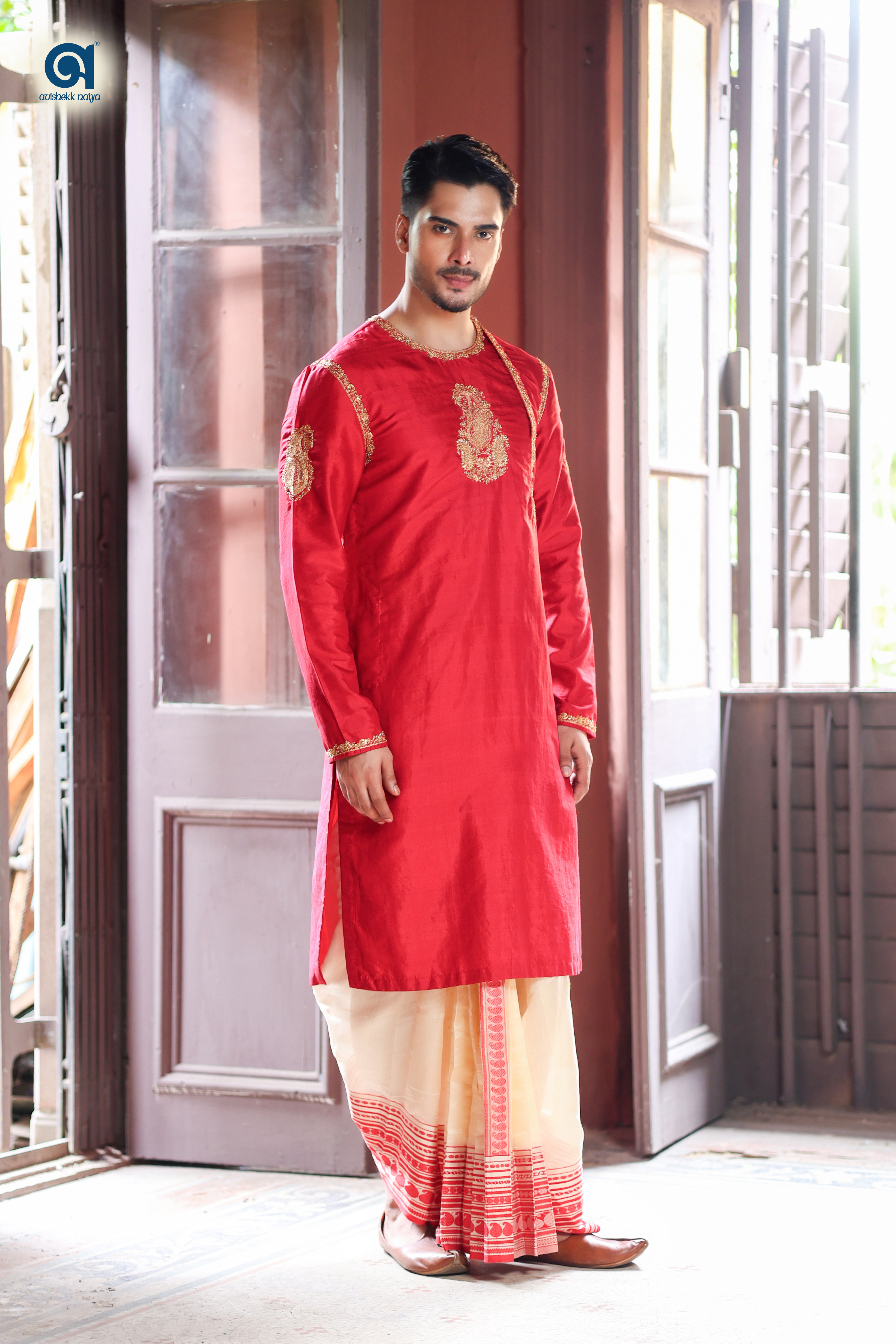 Pure Silk Kurta With Hand Embroiderey Work. Colour: Red Fabric: Handwoven Pure Silk (colour & fabric can be customise) (The mentions price only for kur, price of the Dhoti & Juti is on respective catalog) [Shipping is additional] *Price are mentioned as per 42" chest size, for more than 42" chest size, it will charge extra depending on designs and fabrics. For more information contact - 90519 56595